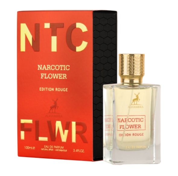 NTC Narcotic Flower Edition Rouge By Maison Alhambra beautiful floral fragrance featuring top notes of Bergamot, Lychee, and Peach, a heart of Jasmine, Lily of the Valley, and Vanilla, and a base of Musk and Orange Blossom.